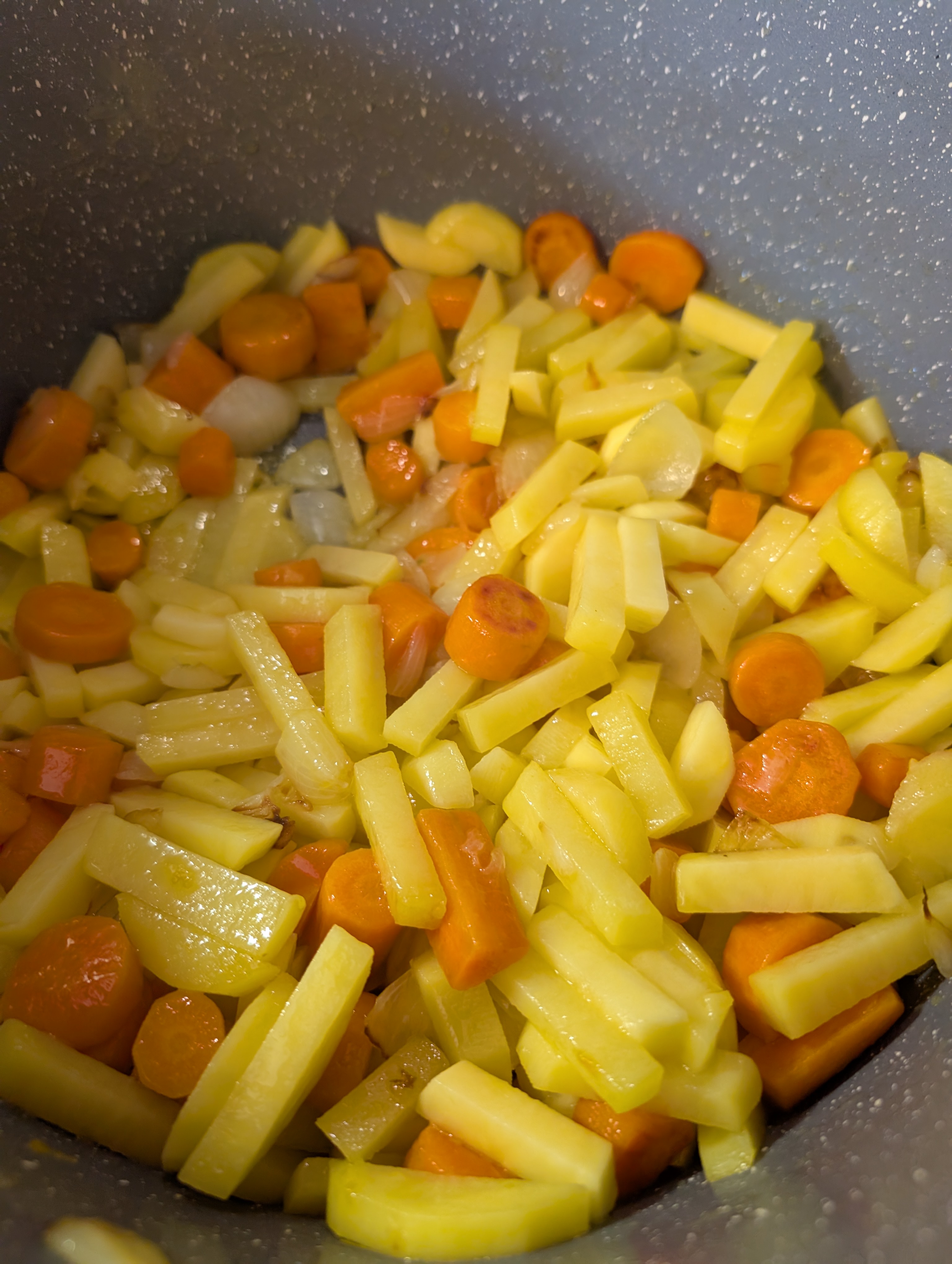 Zunaechst wurden Zwiebeln, Kartoffeln und Moehren angebraten: