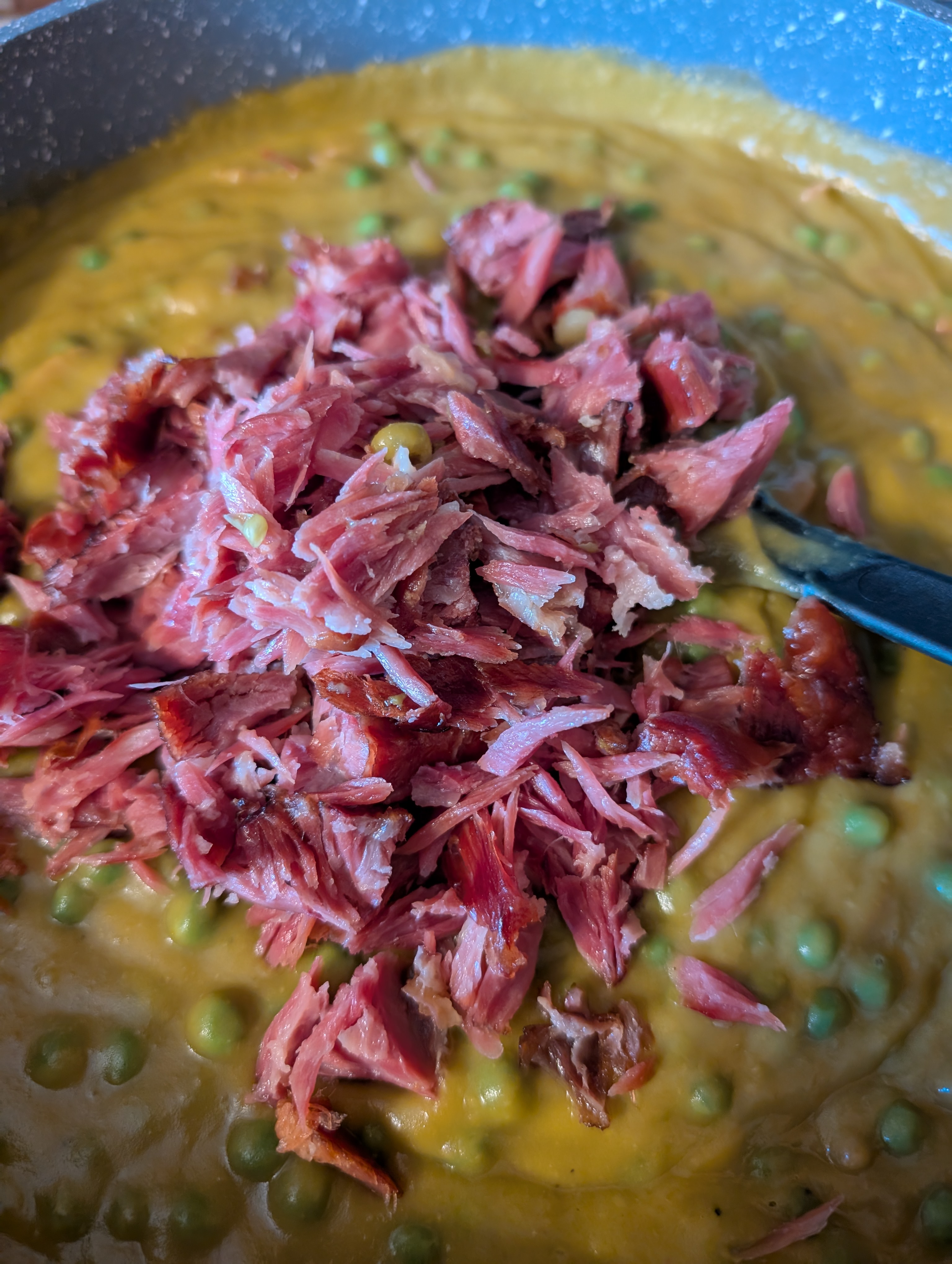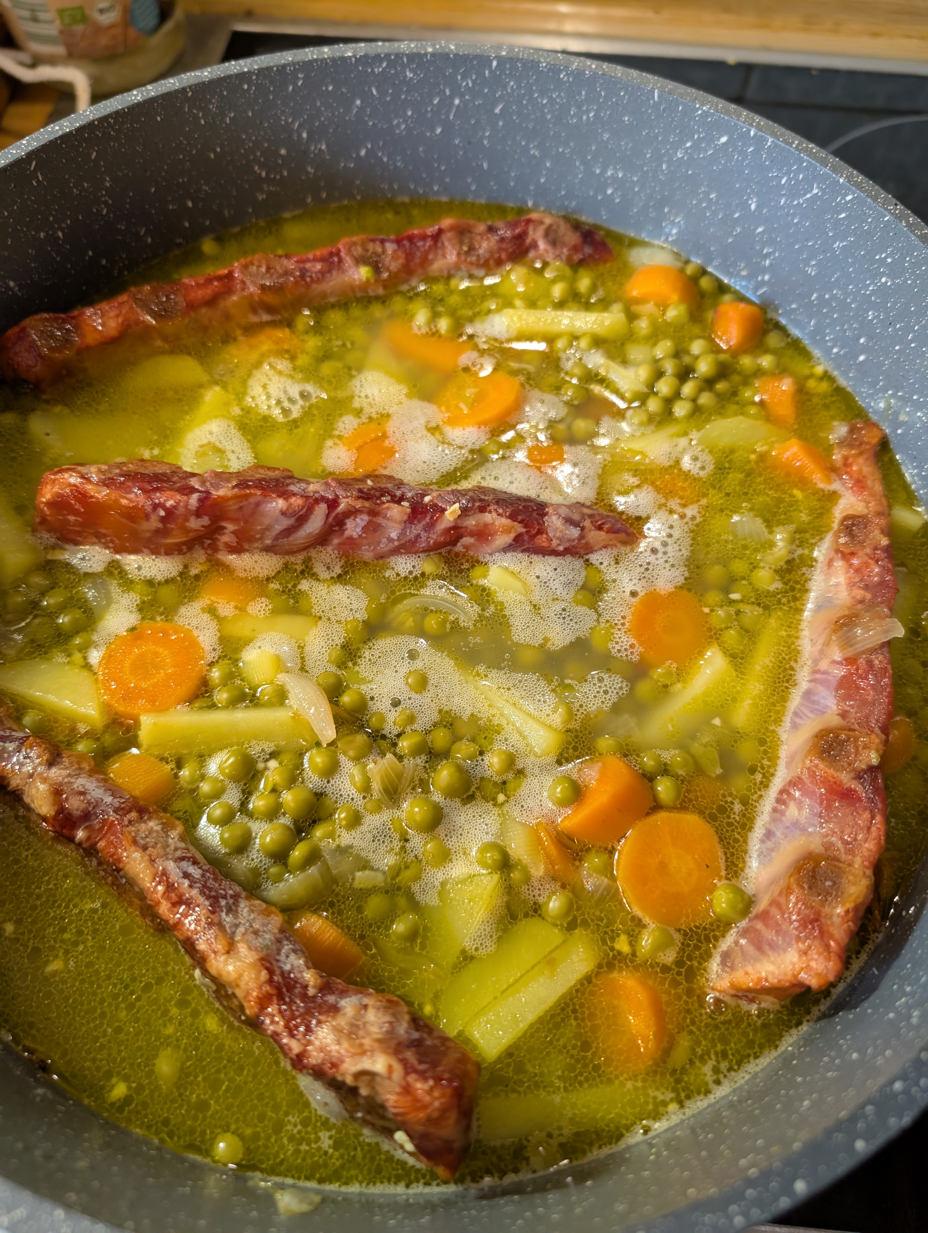 Die Rippchen rausnehmen und von den Knochen befreien, in der Zwischenzeit den Topfinhalt mit einem Puerierstab behandeln und noch ein paar Erbsen dazu geben: