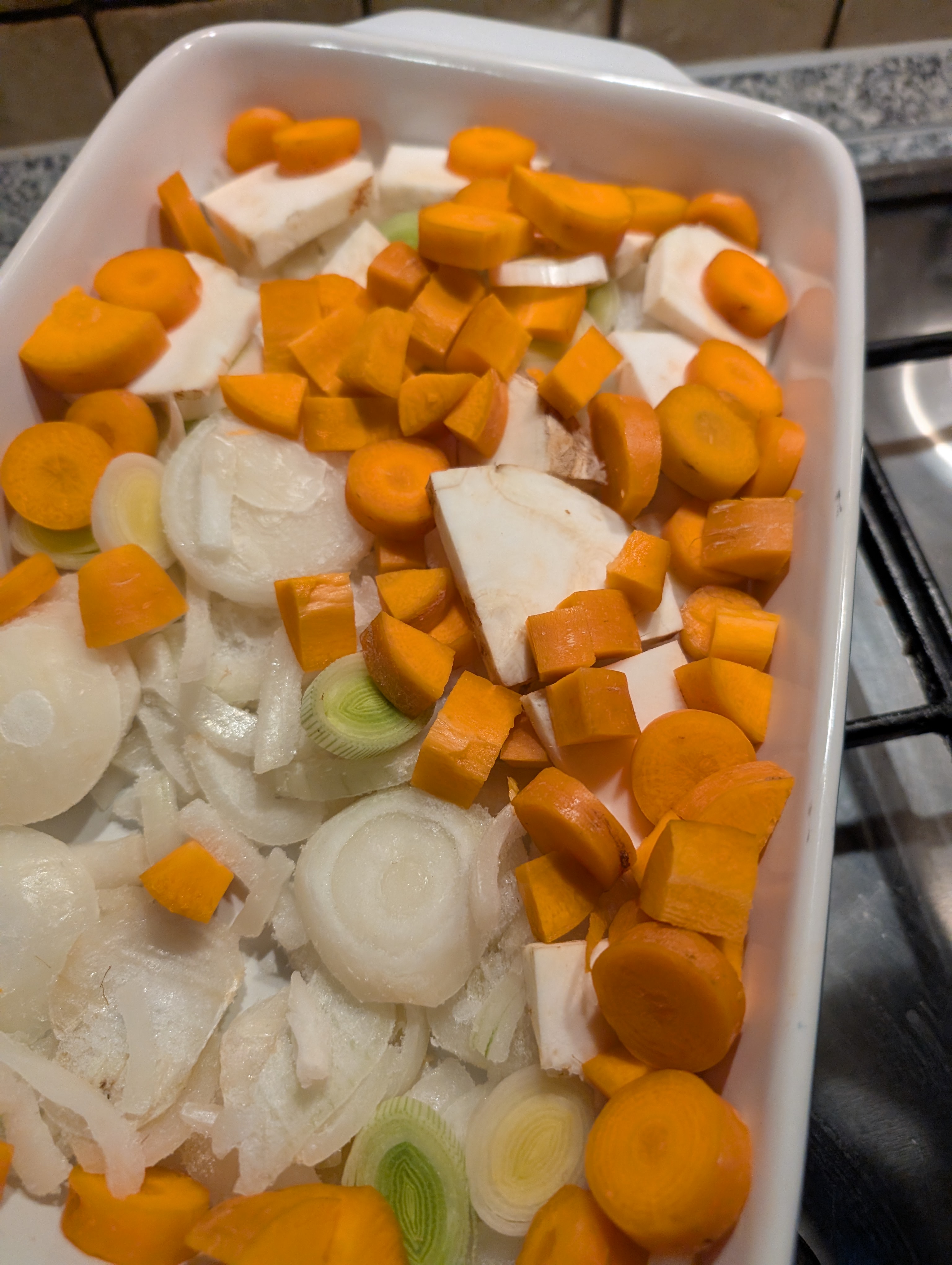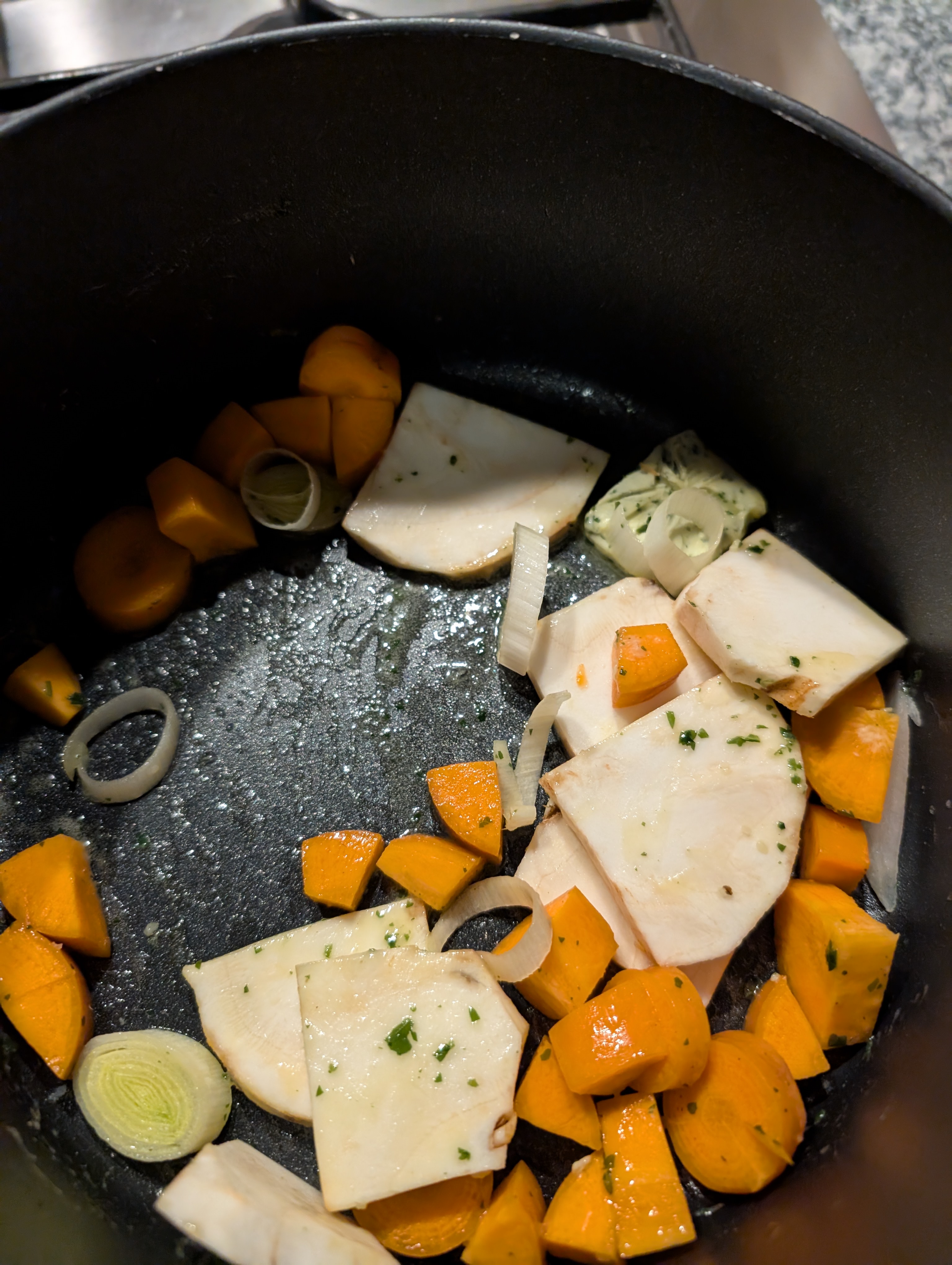 Erstmal habe ich angefangen einen Gemuesefond fuer die Sosse vorzubereiten und dazu Suppengemuese angeschwitzt:
