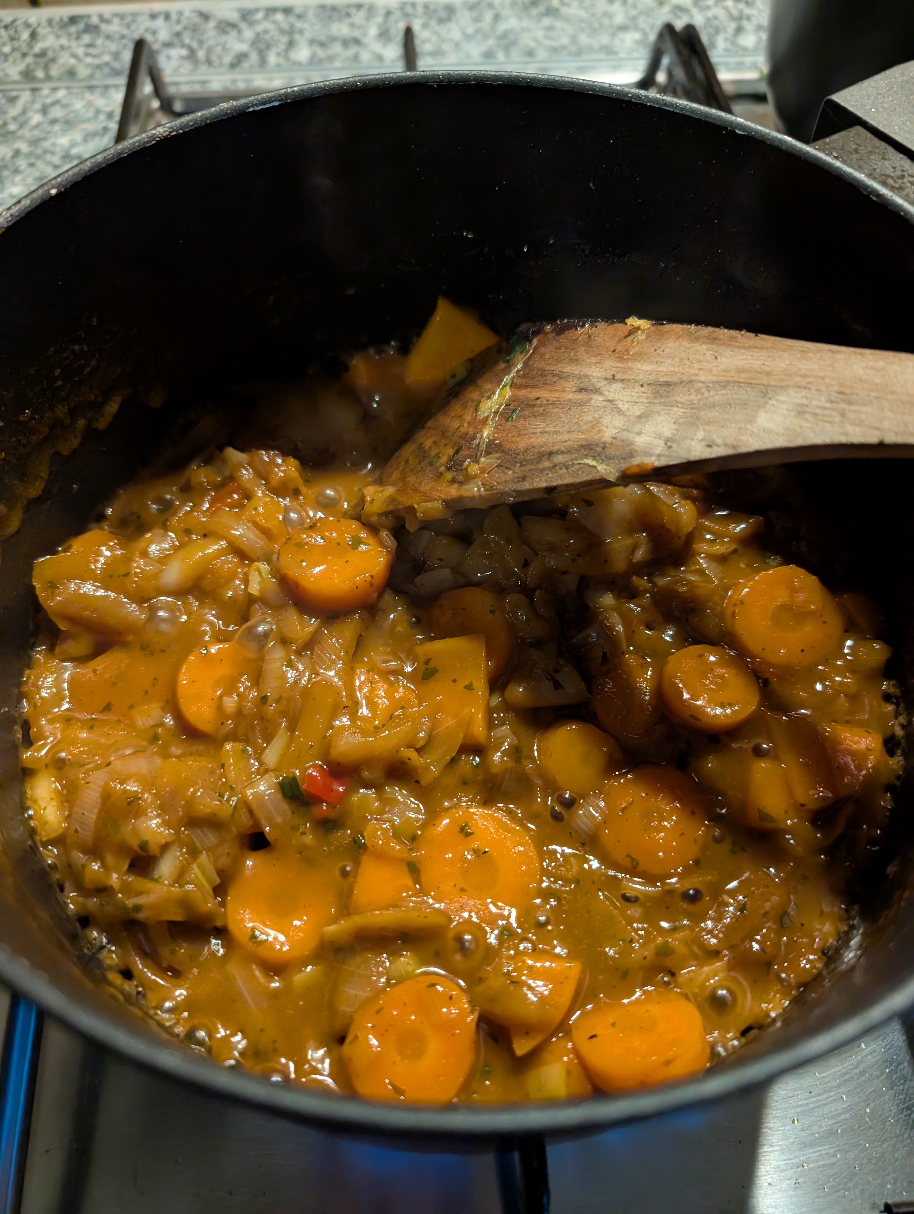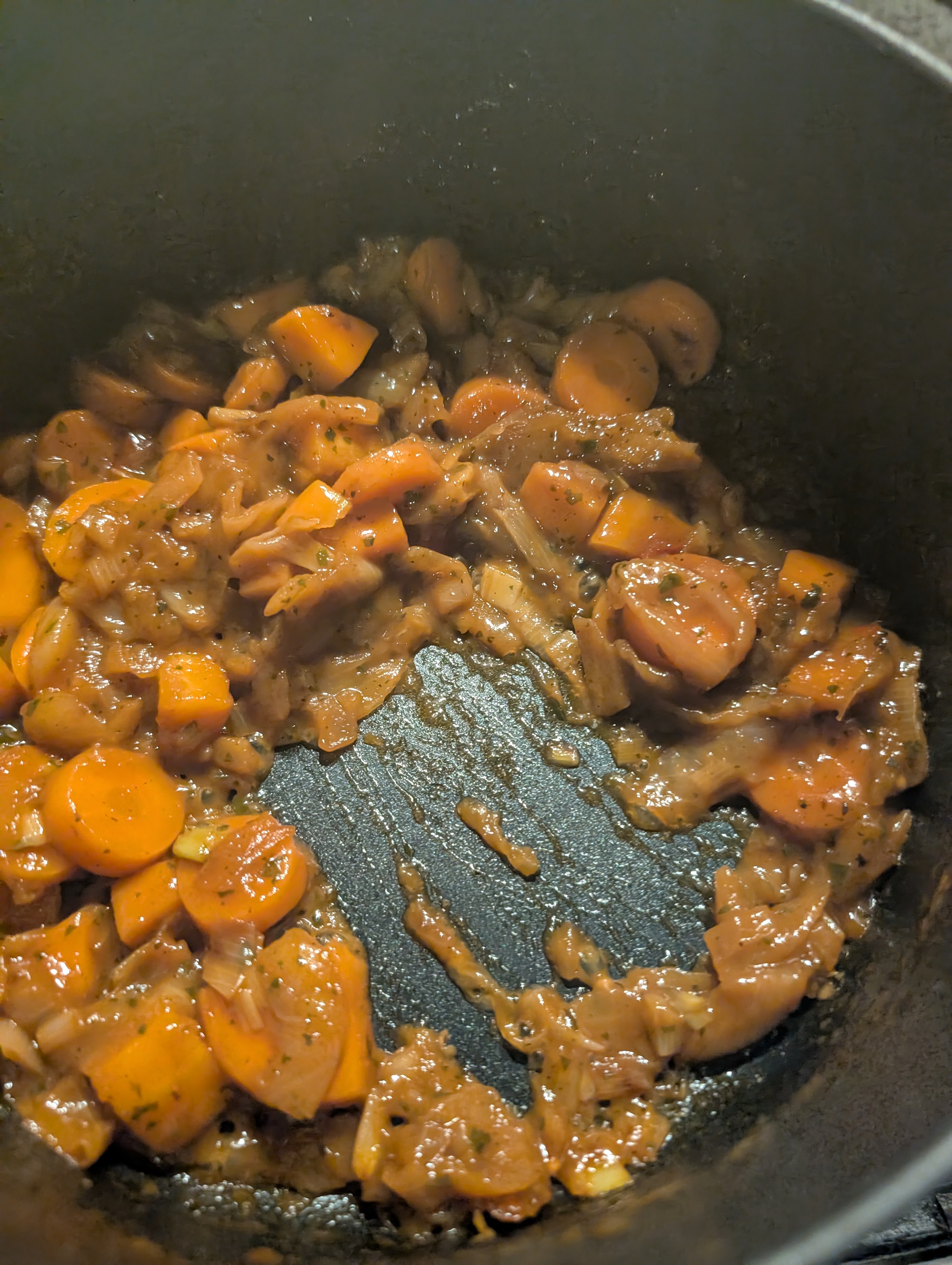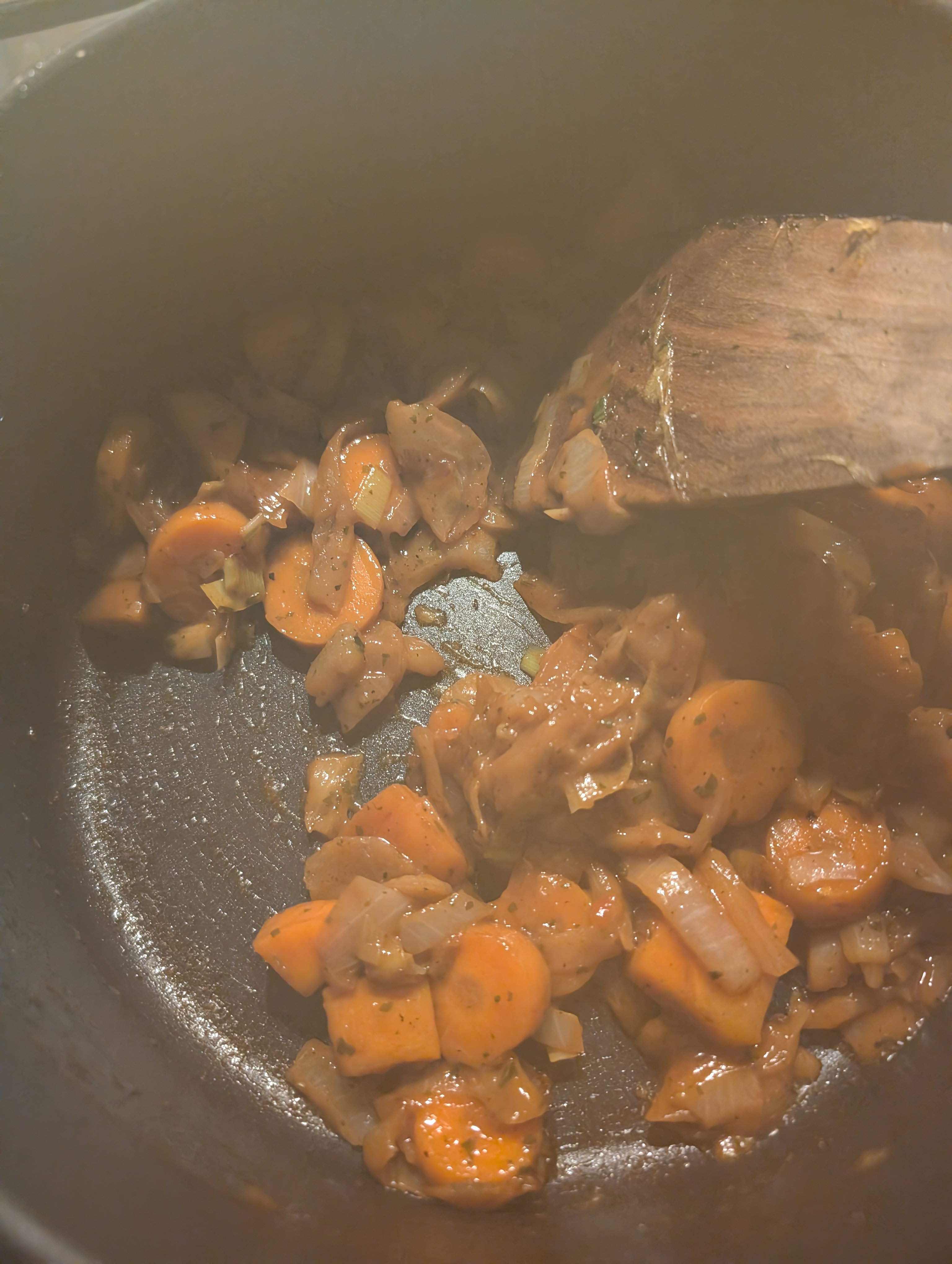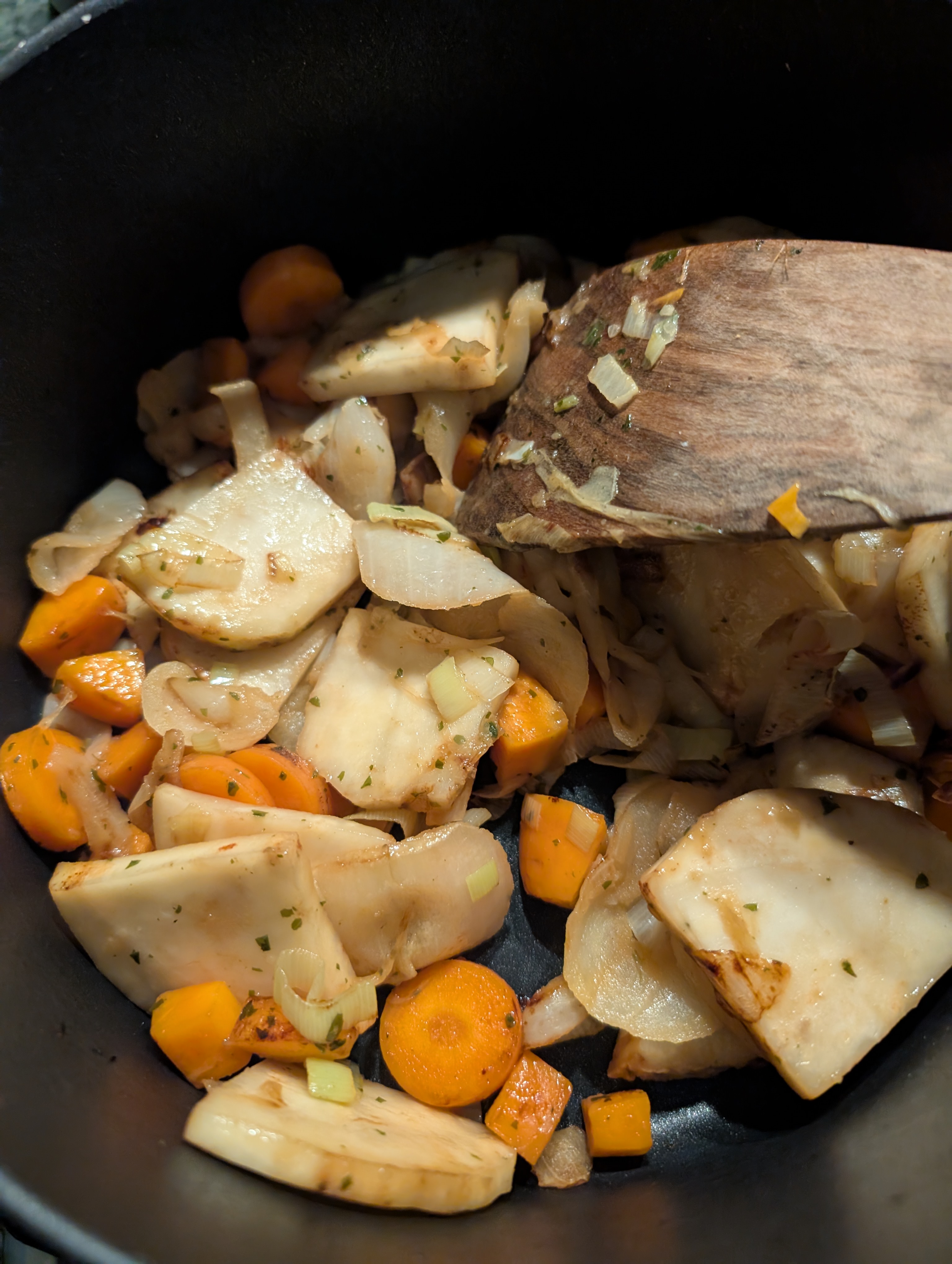 Und mit dem Rest Suppengemuese weitergemacht, dieses immer wieder mit Gemuesefond abgeloescht und einreduzieren lassen: