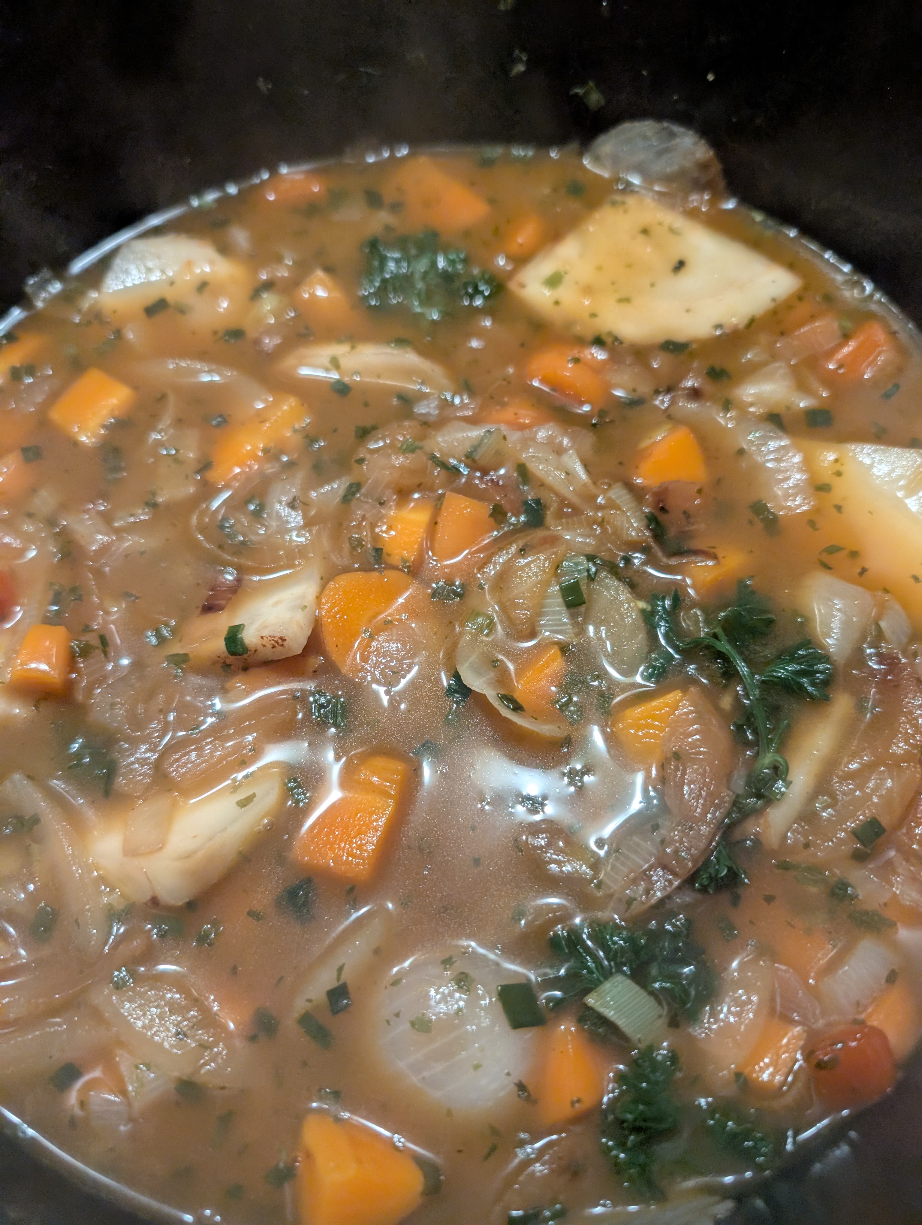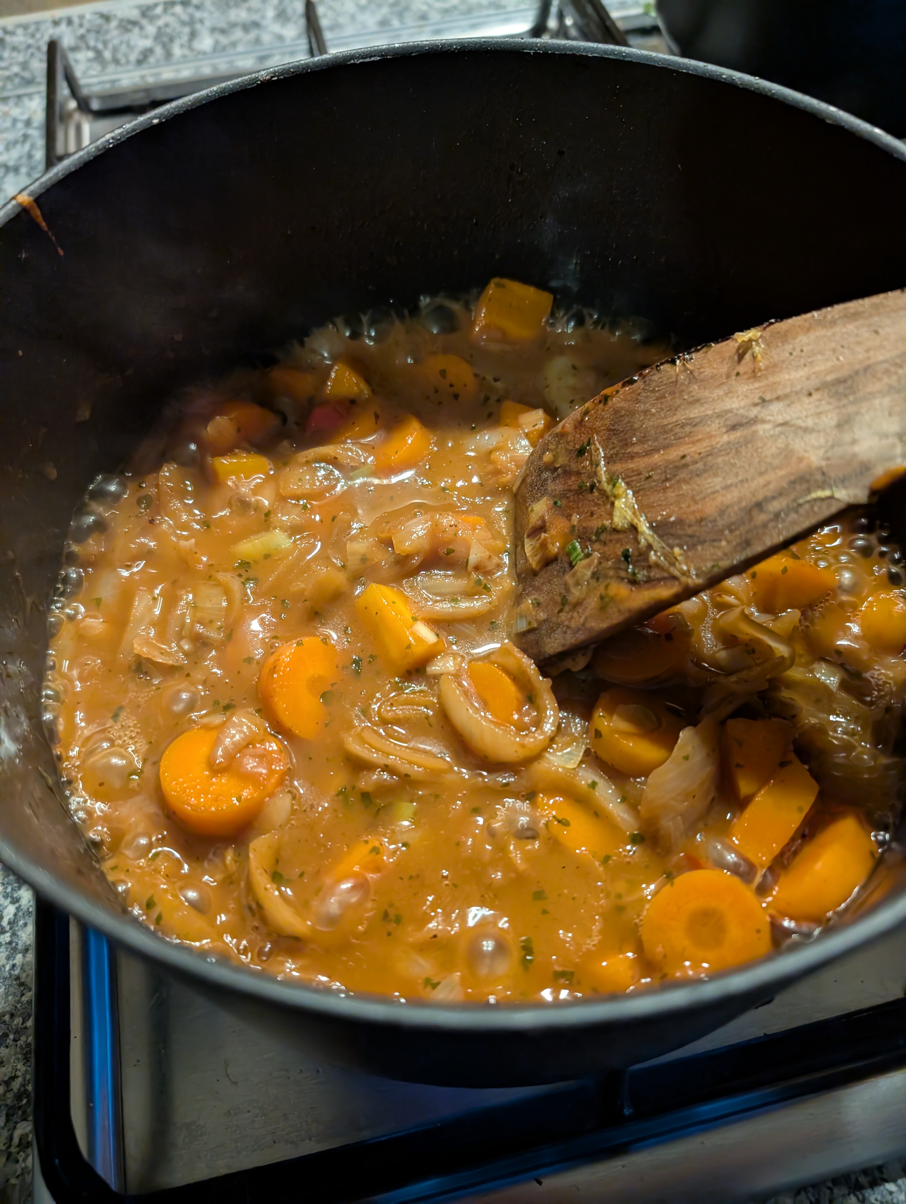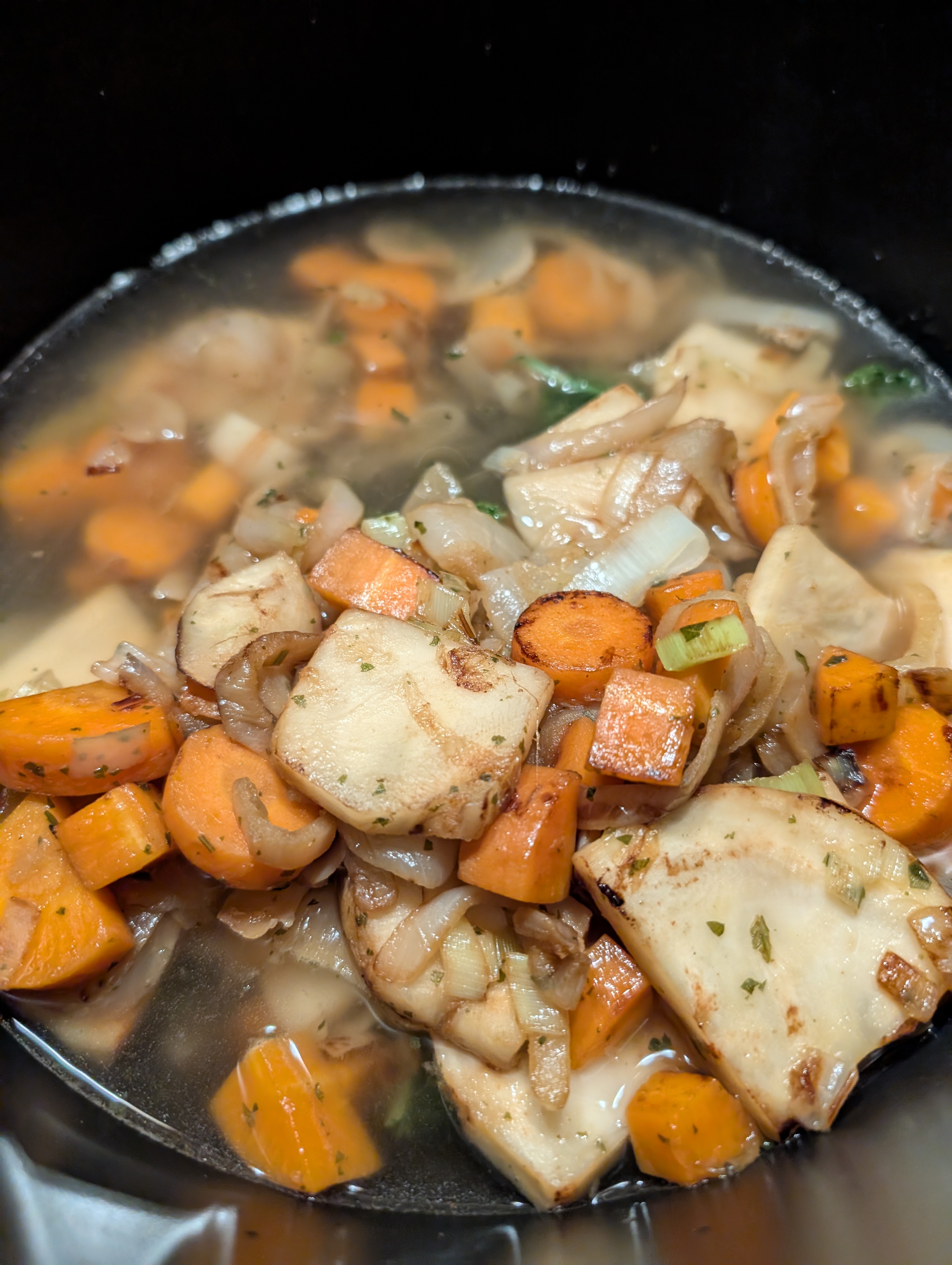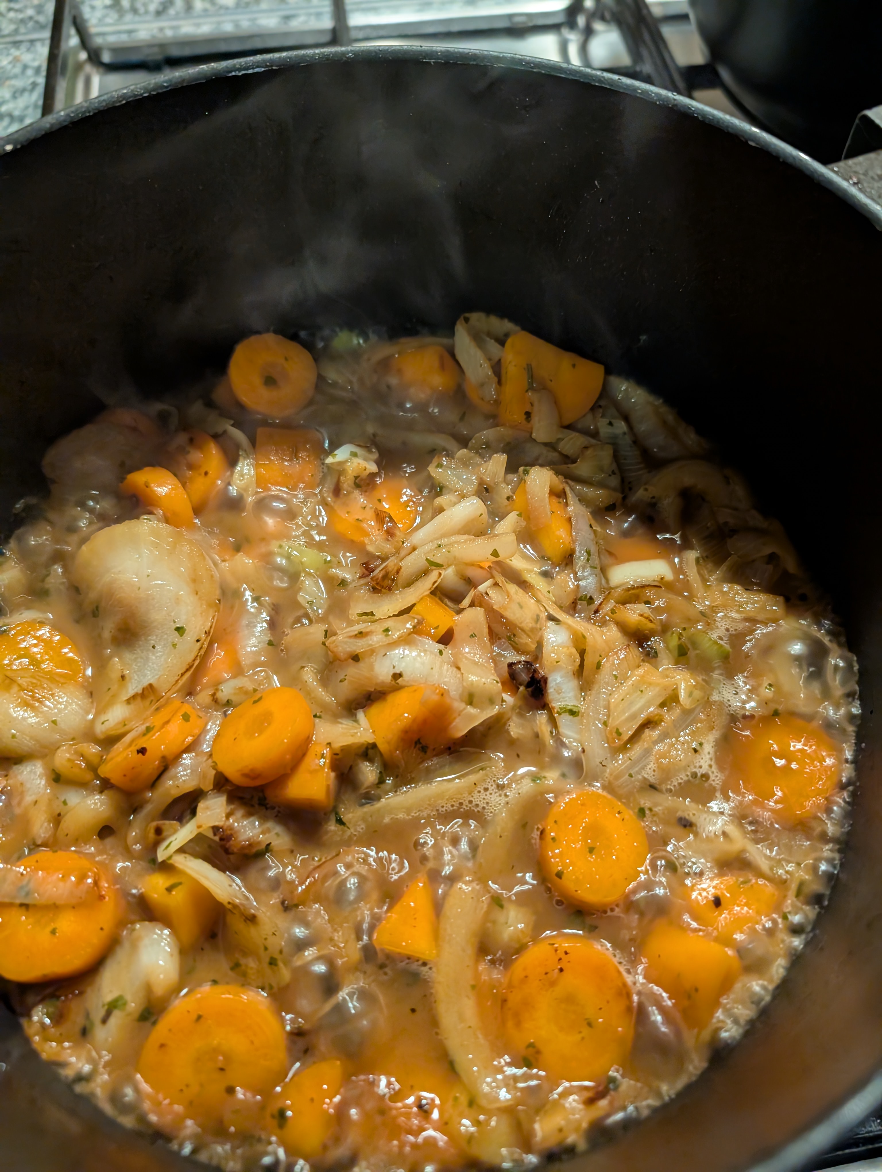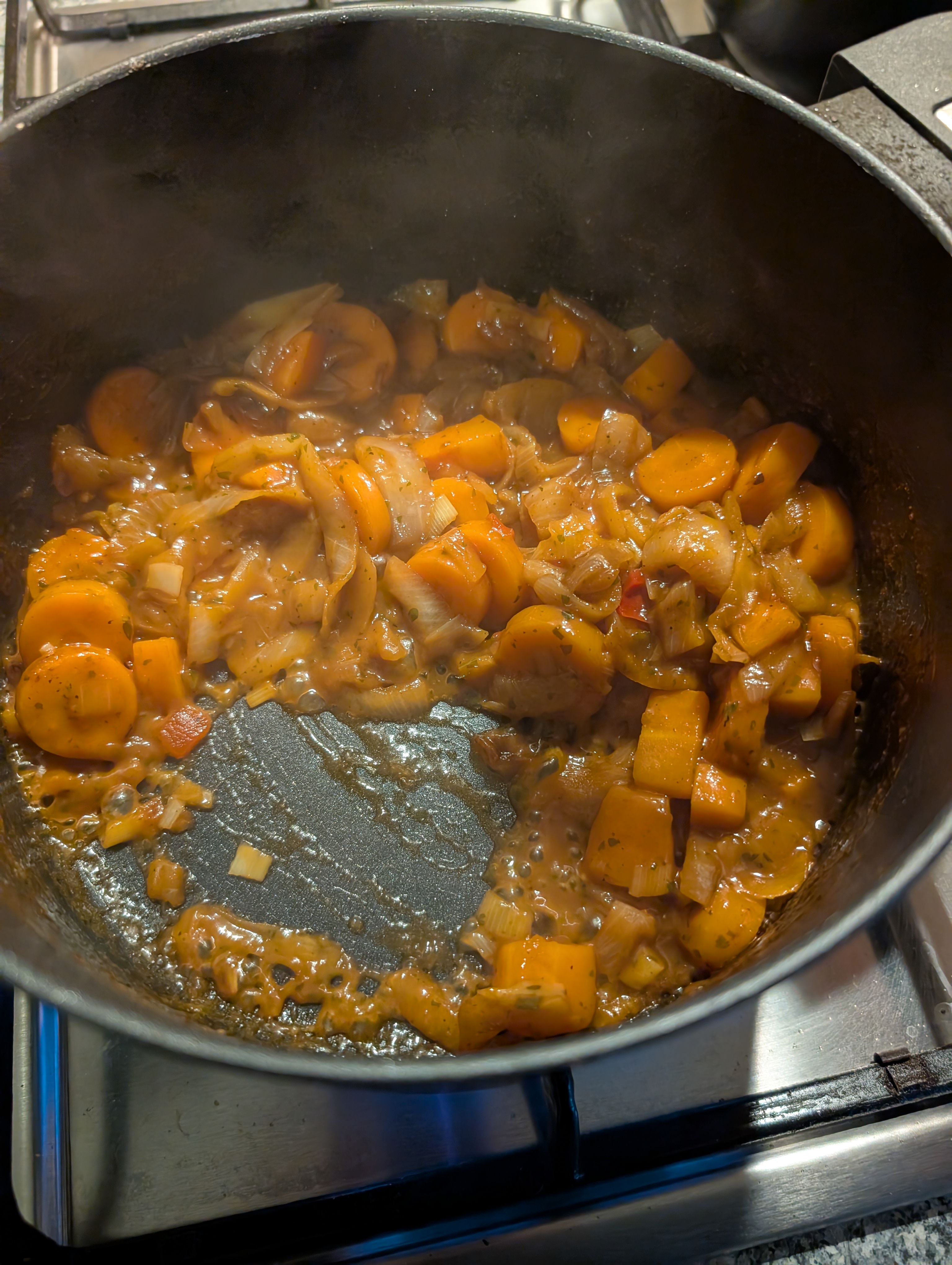 Und mit dem Rest Suppengemuese weitergemacht, dieses immer wieder mit Gemuesefond abgeloescht und einreduzieren lassen: