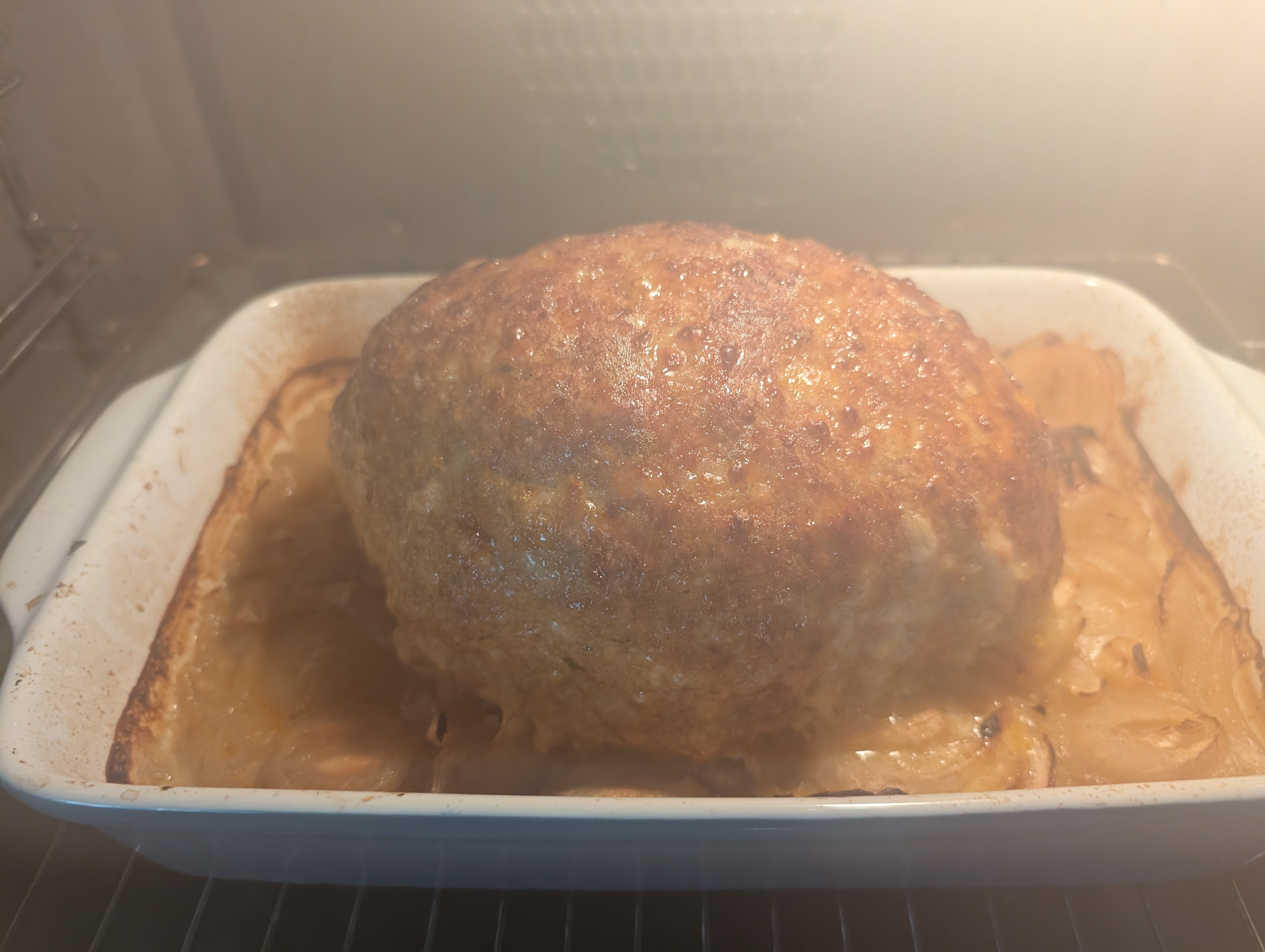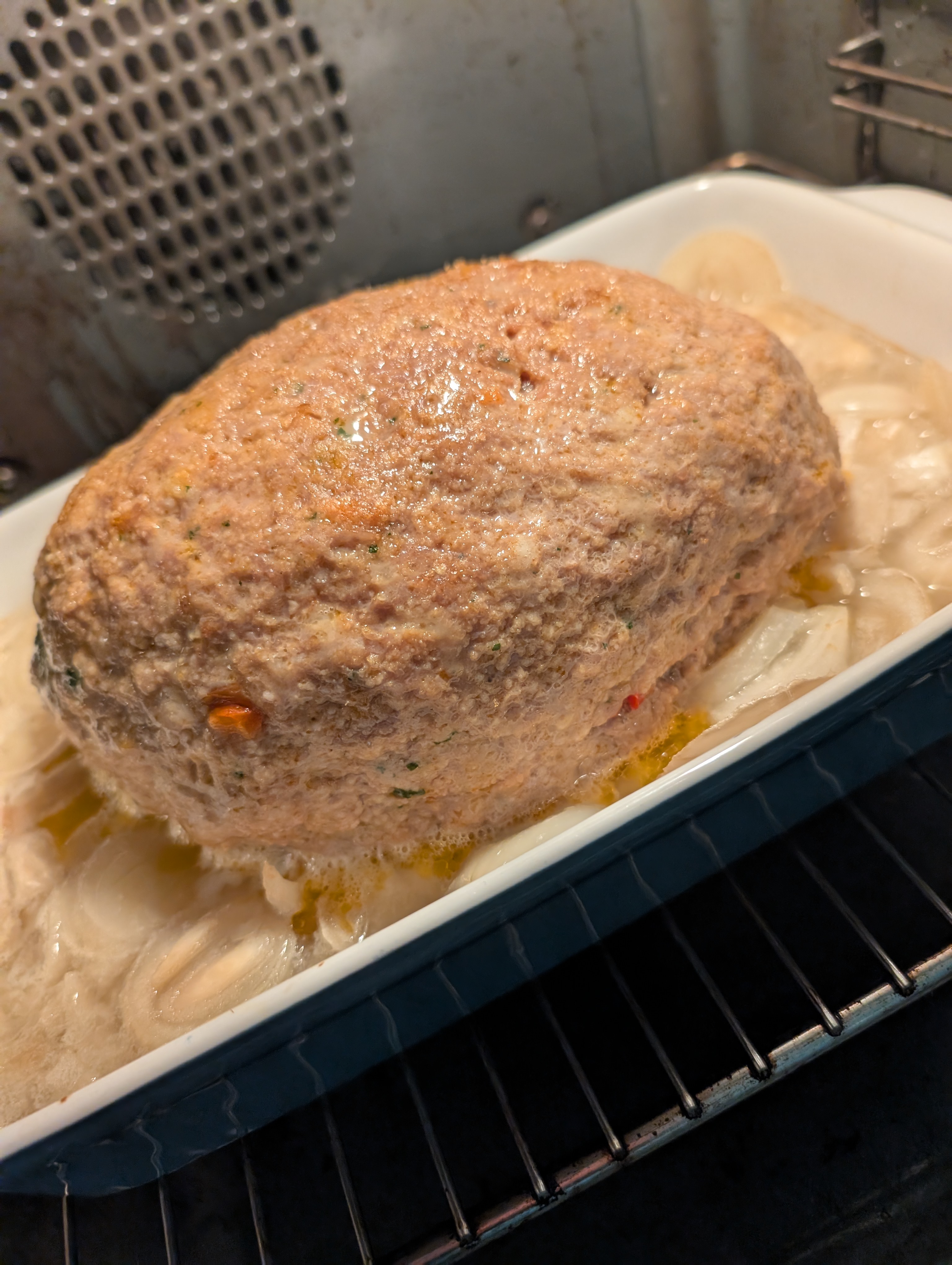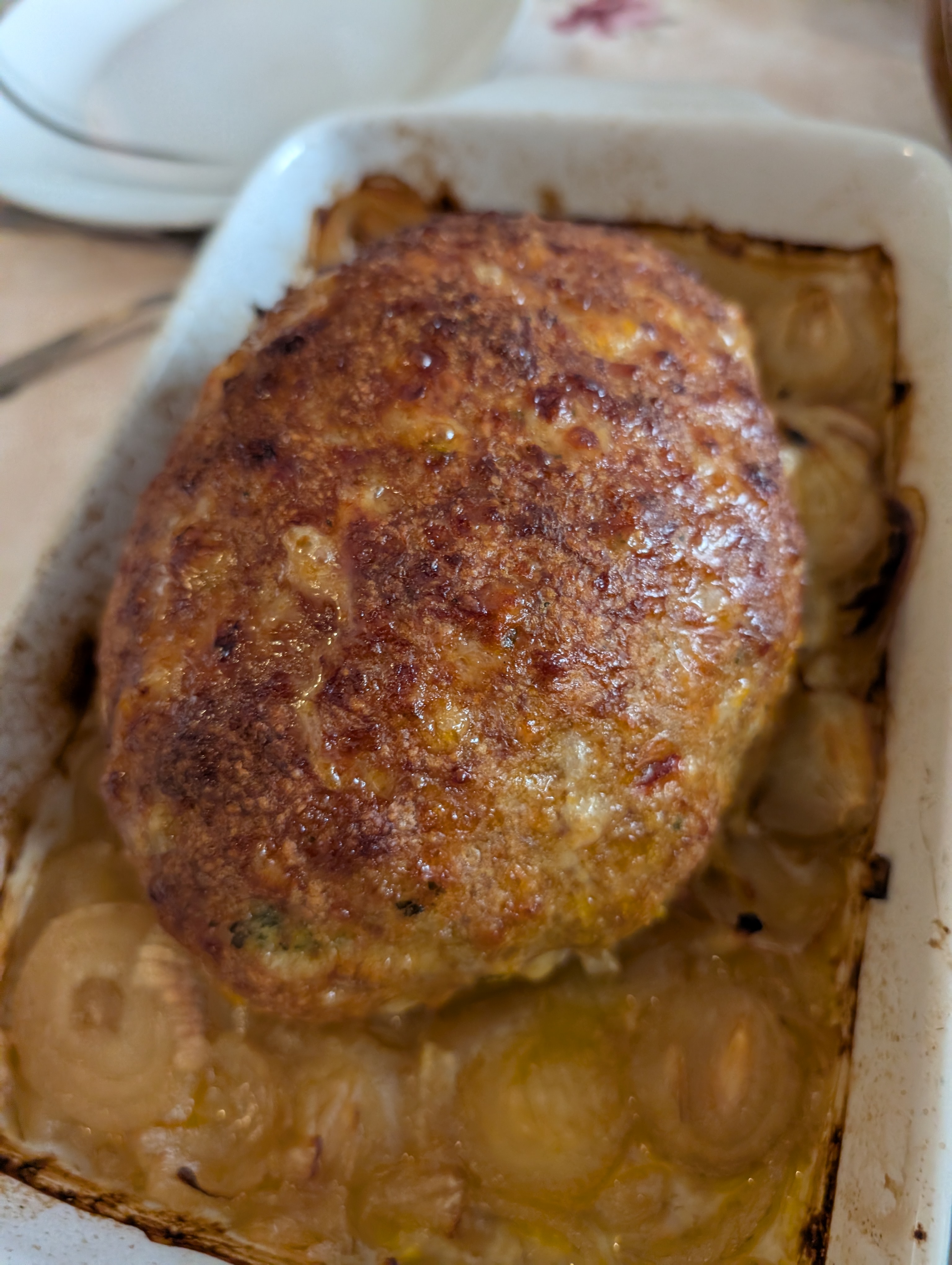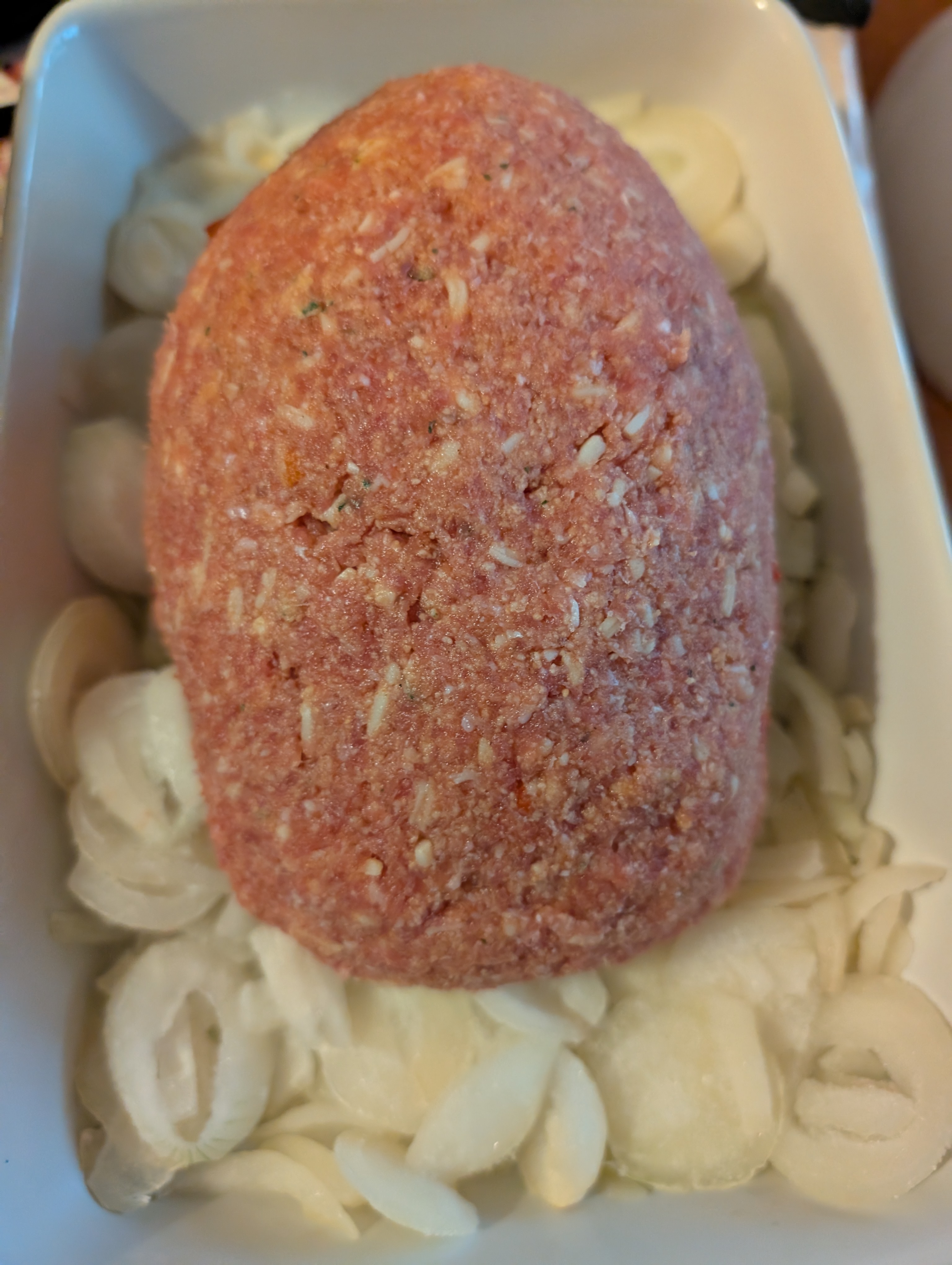 Den Hackbraten (ungefuellt) geformt und auf Zwiebeln gebettet: