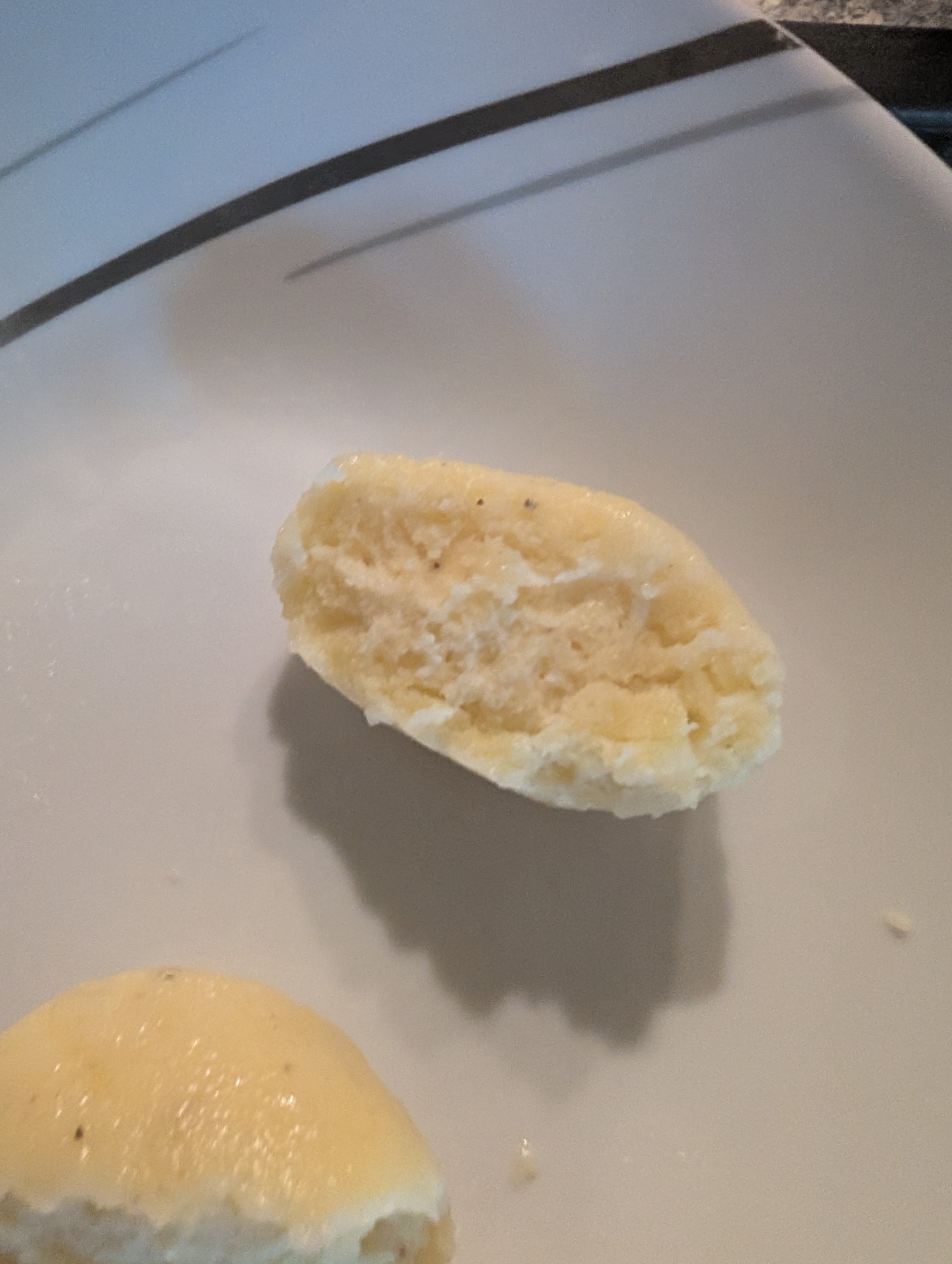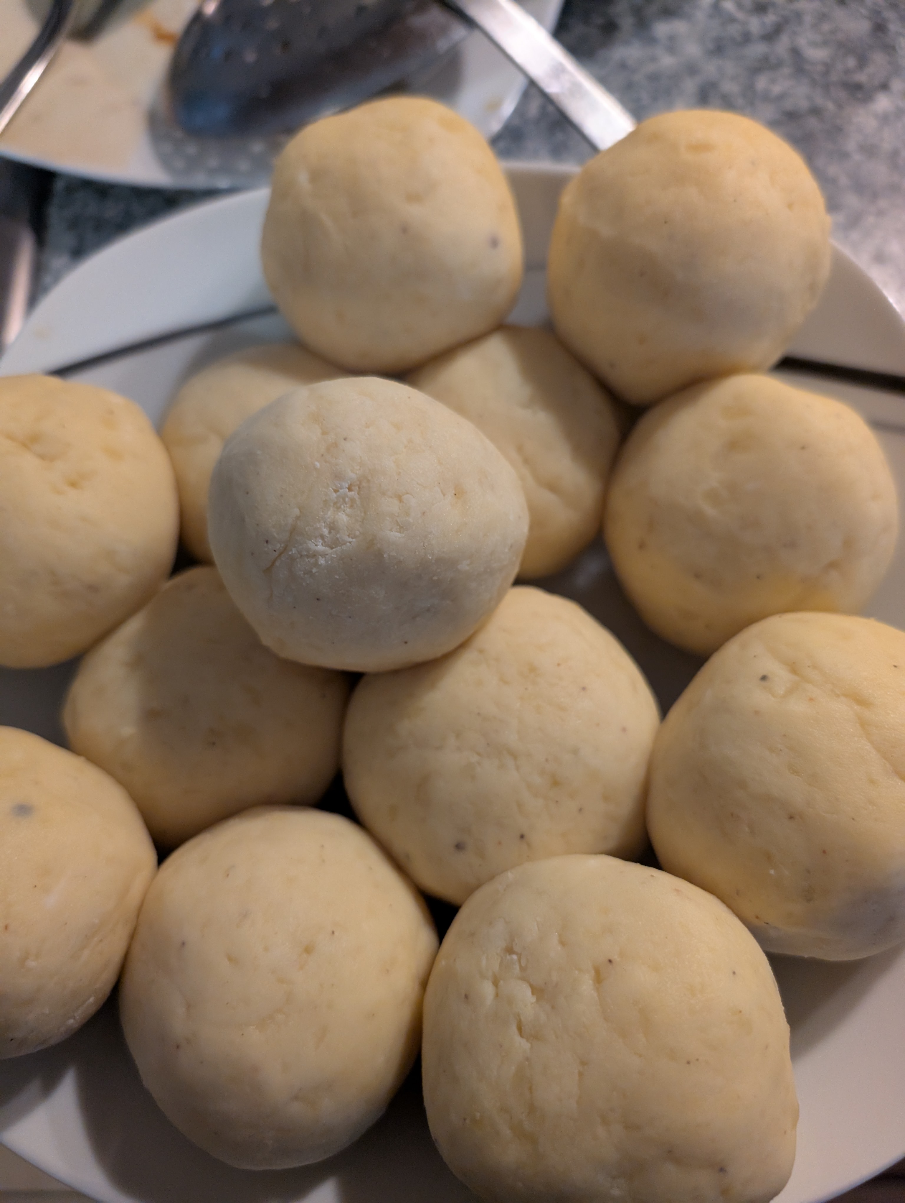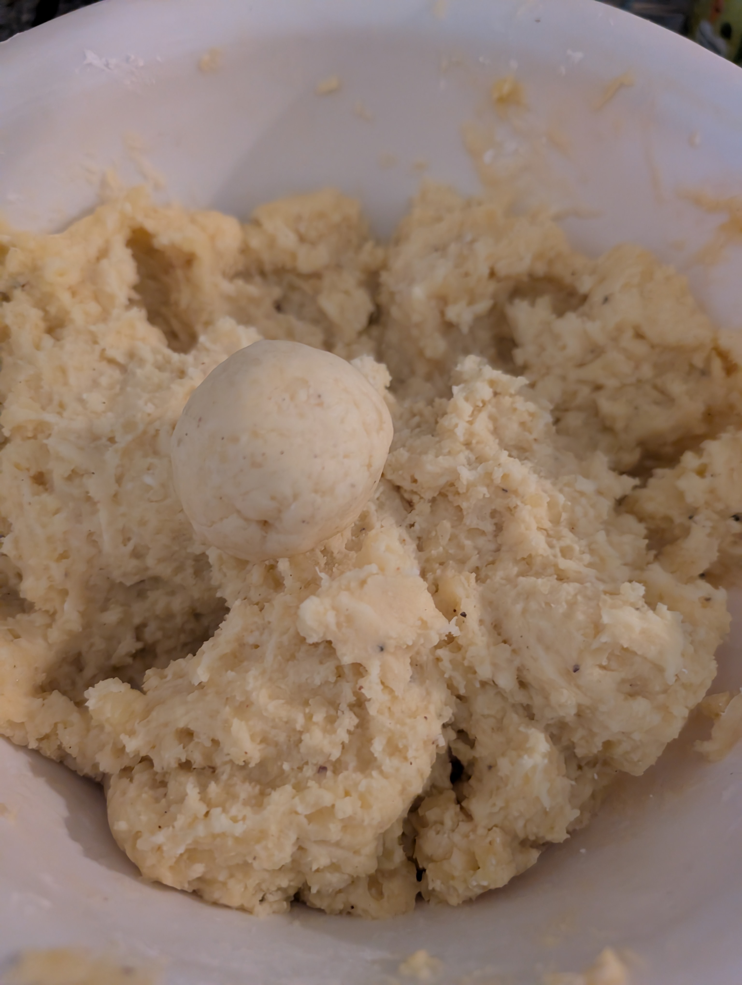 Mit Butter, Ei, Salz, Pfeffer, Muskat und Staerke mischen und eine Testkugel geformt: