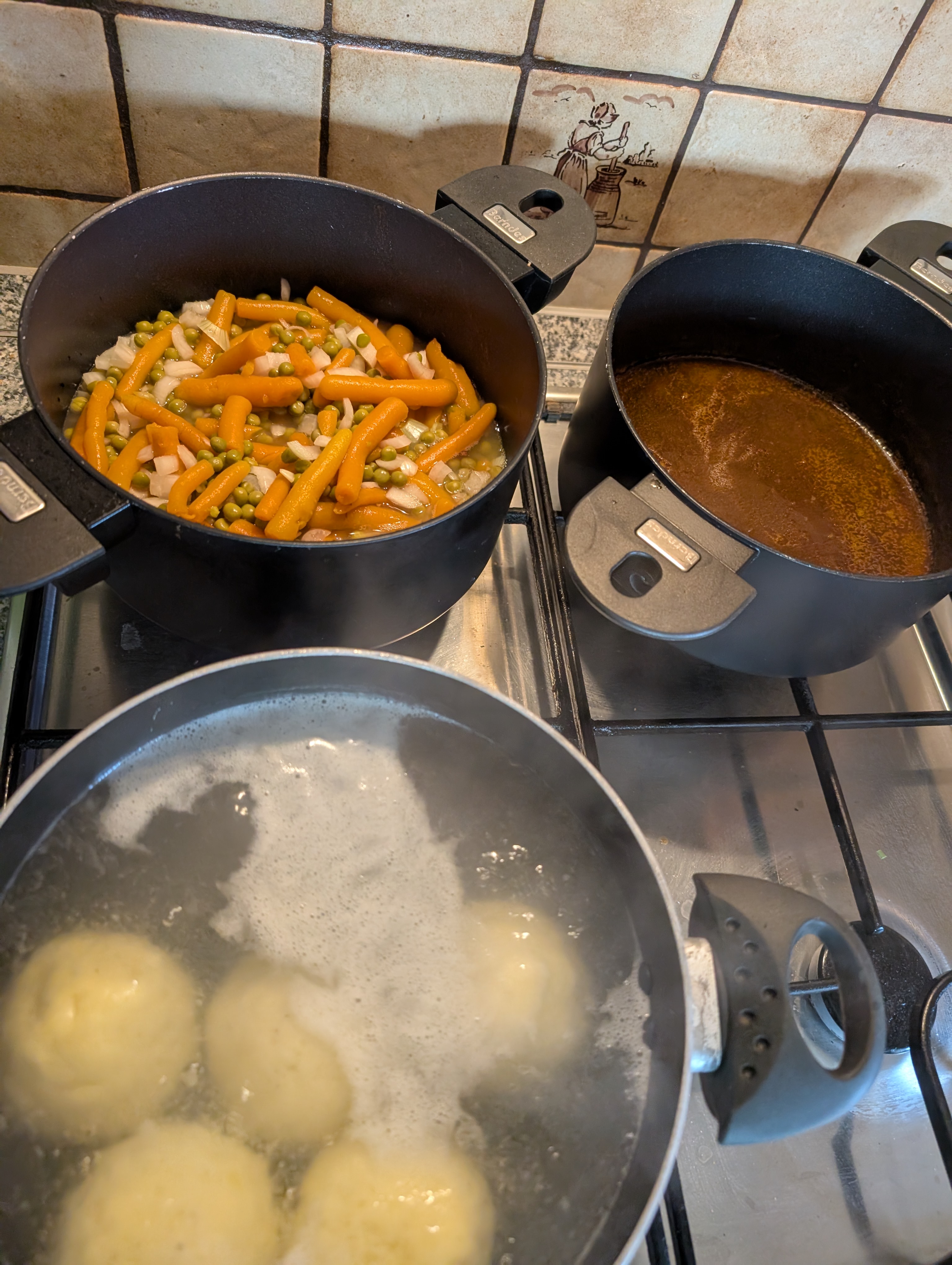 Und auf den Herd (oben Rechts der vom ausgekochten Gemuese befreite Gemuesefond):
